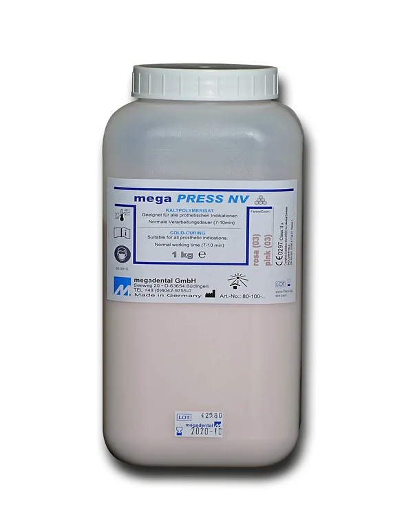 Mega PRESS NV est un polymère autopolymérisable à froid à base de méthacrylate de méthyle.
