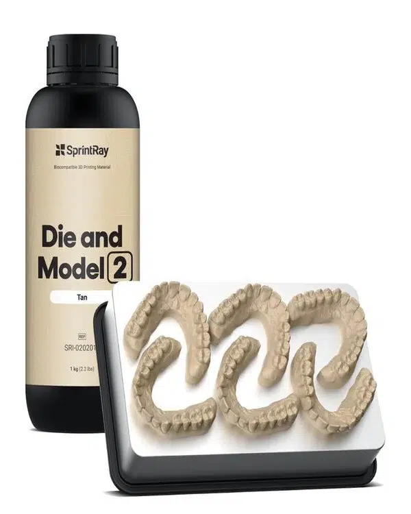 La résine Die & Model 2 beige de SprintRay est un grand pas en avant pour les matériaux de modélisation d’impression 3D dentaire. De couleur beige qui imite le plâtre dentaire classique, ce matériau avec un niveau de sédimentation de pigment extrêmement bas vous permet de réduire le temps de mélange en vous laissant plus de temps pour l’impression. Une adhérence améliorée à la plaque de base et une augmentation du module de flexion et de la résistance, offrent des taux de succès plus élevés et une réduction des risques de rupture.